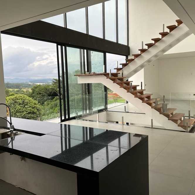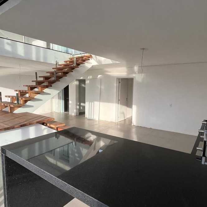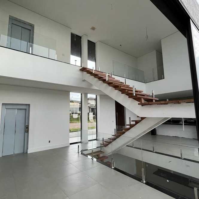 Térreo: Living com pé direito de 6 m; Cozinha com ilha de centro entregue equipada com armários e eletrodomésticos, Dispensa, escritório com depósito ou 5 º dormitório com suíte, varanda e closet, área de serviço, lavabo, 2 vagas de garagem coberta;